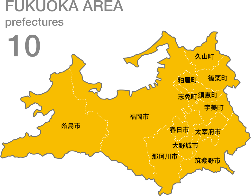 福岡市を中心に春日市・大野城市・太宰府市・筑紫野市・那珂川市・糸島市・志免町・粕屋町・宇美町・須恵町・篠栗町その他の地域はご相談に応じます。